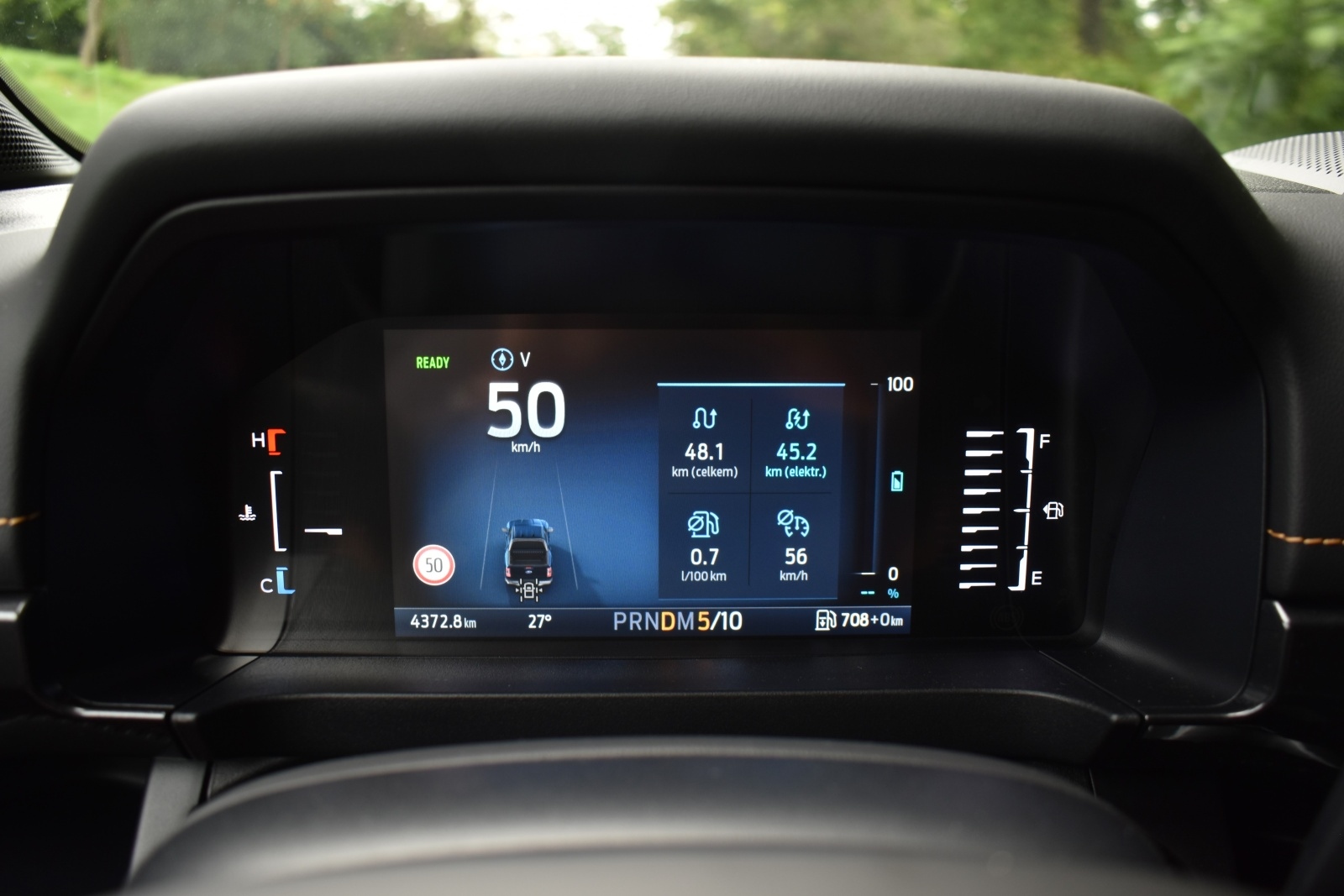 Už jen dvanáctipalcový vertikální displej, který má plug-in hybrid už od základní verze vypadá jako vypůjčený rovnou z kugy nebo exploreru. Displej navíc umí promítat obraz z 360stupňové kamery a lze přes něj ovládat také prémiové audio s deseti reproduktory. O bezdrátové konektivitě Apple CarPlay a Andoird Auto nemluvě, stejně jako standardním navigačním systému.