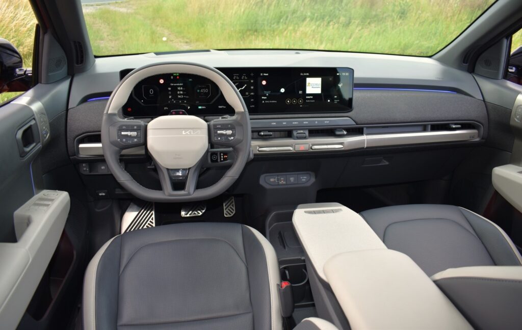Automobilka sama tvrdí, že je interiér navržen v duchu obytného prostoru. Jeho hlavním prvkem je trojitý panoramatický displej, tvořený dvěma dotykovými obrazovkami o velikosti 12,3 palce (místo analogových ukazatelů a uprostřed palubní desky) a 5,3palcovým segmentovým displejem pro ovládání klimatizace. Ta má však i vlastní fyzické kolébkové přepínače. Kromě toho může být EV3 vybavena i head-up displejem. V interiéru dominují kvalitní plasty; na hodnotné zpracování jsme u Kie už zvyklí.