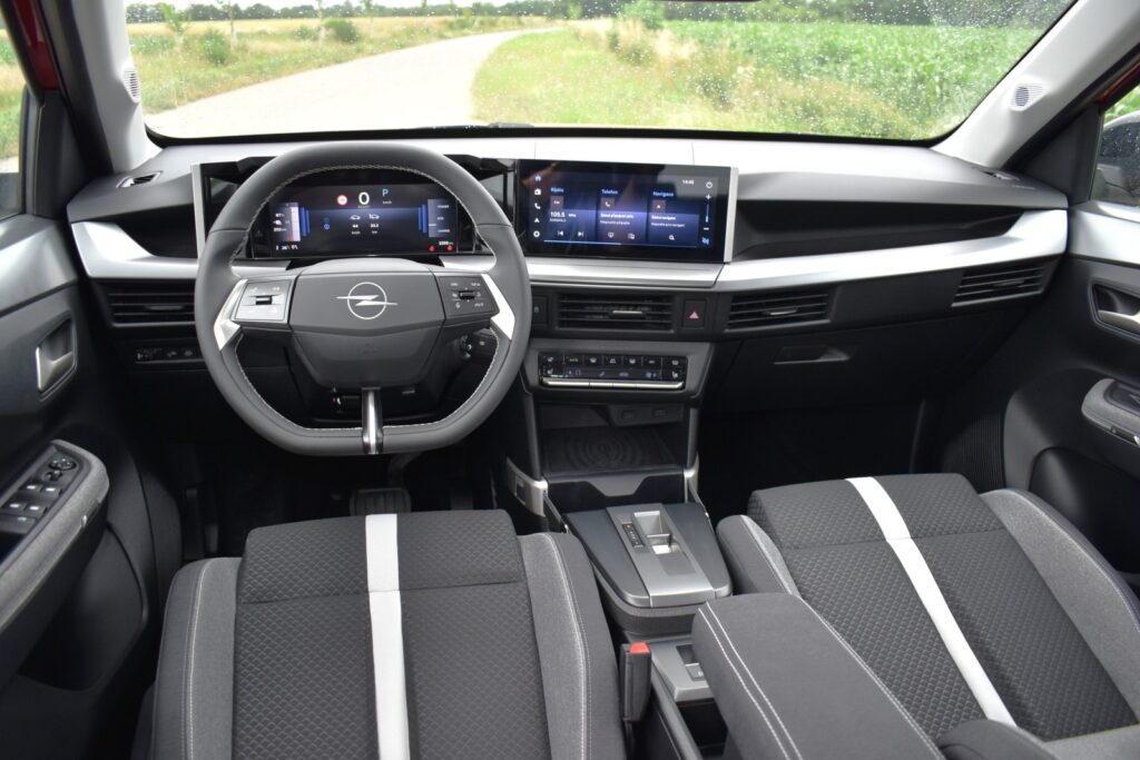 Interiér je koncipován v duchu chytrých řešení a maximální praktičnosti. Vzdušné pojetí zdůrazňuje horizontálně členěná přístrojová deska a široké dekory ve dveřích. Řidič má k dispozici digitální kokpit Opel Pure Panel s 10″ displejem, infotainment má shodnou úhlopříčku. Ve základní výbavě místo obrazovky figuruje stanice pro chytrý telefon, čímž vychází vstříc uživatelům vlastních zařízení.