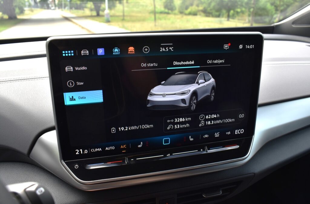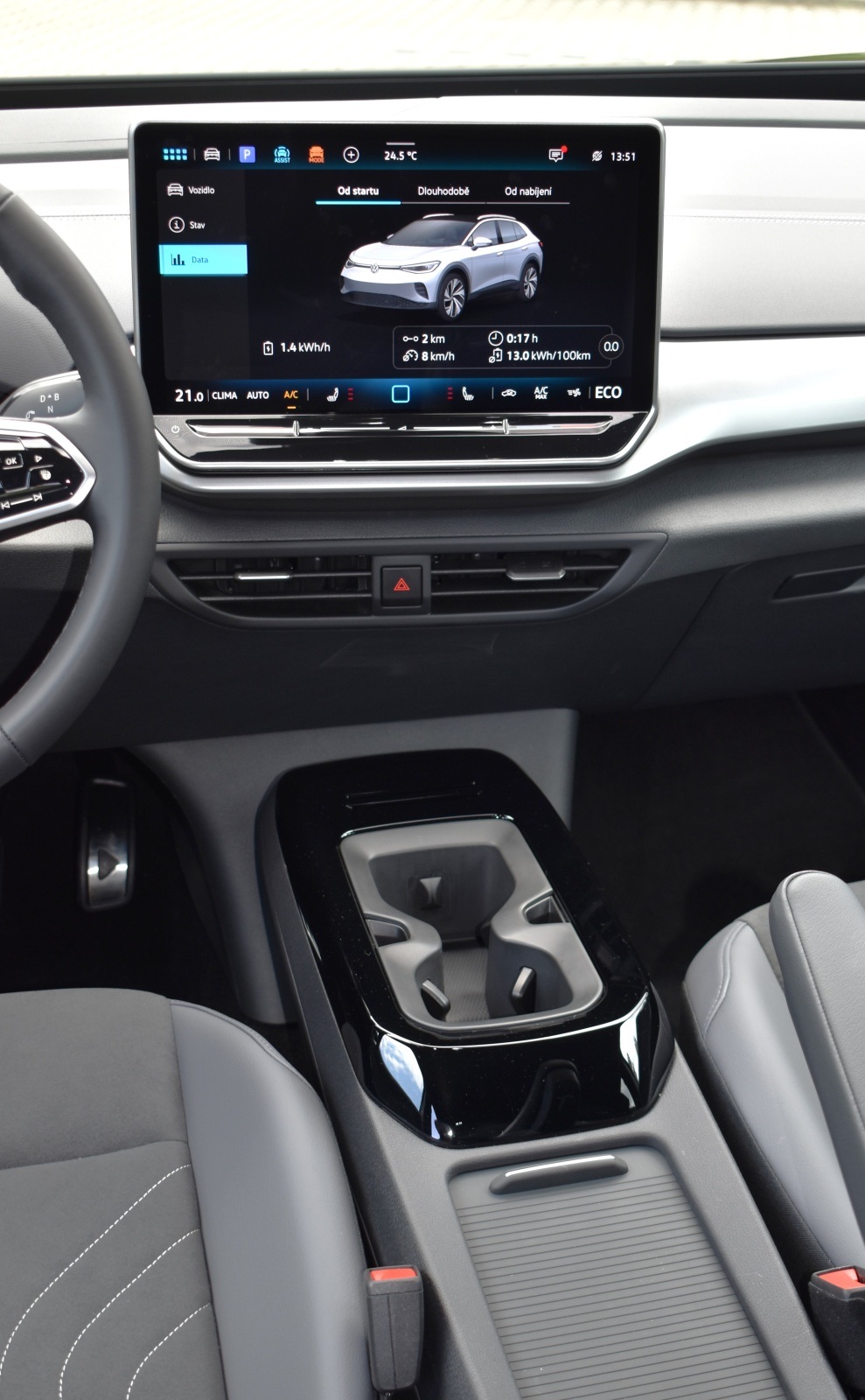 Ovládání palubního systému probíhá na displeji s uhlopříčkou 12,9 palce, který je standardně vybaven i navigací. Ta funguje velmi slušně a zobrazuje dostupné nabíjecí body. Před řidičem není velká obrazovka, ale malý, velmi dobře čitelný a přehledný displej, který zobrazuje nejdůležitější provozní údaje a nastavuje se spolu s volantem.